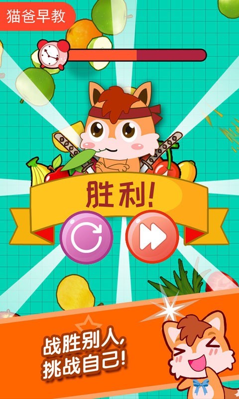 1、滑动手指,将可爱的水果切成两半,炸弹扣分,闹钟加时;