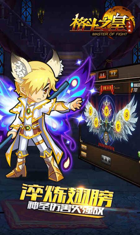 《格斗之皇飞升版》是全球首款热血动漫2D横版动作过关手机网游,游戏采用全球领先的cocos2D-X引擎进行开发,热血动漫画风,注重战斗中的操作与打击感,整体表现华丽,操作顺畅。游戏内容健康向上,玩法简洁而不失深度。 游戏讲述了一群勇士与光明之龙战胜黑暗之龙的故事。华丽的战斗技能表现和打击感,炫酷的满屏特效,街机级的极限连击组合和跑位战斗,百种幻兽,超炫的战斗技能,一切尽在格斗之皇!