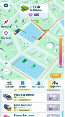 2、购买新车来让人们有更多的选择,还能点击升级,将所有属性提升到最高,这样你也能赚更多的钱。