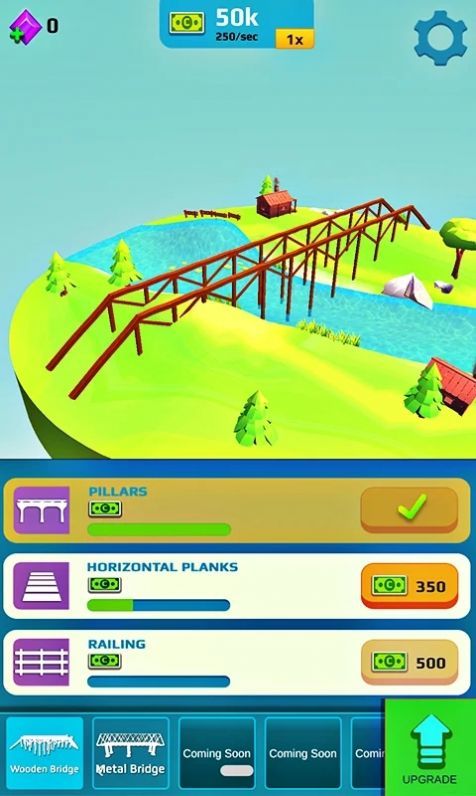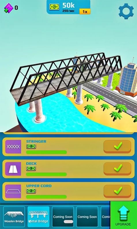 空闲桥梁设计游戏是一款模拟桥梁升级的放置养成类游戏,玩家能在这个独特的体验中让自己能打造更加坚固又精美的桥梁,完成更多挑战后能方便城市的交通,让每个人的出行都会更便捷,你将能在更多不同的地点完成任务,选择正确的桥梁结构并能快速的完成你的建筑。遇到难题时,您还可以使用游戏中的提示系统。这里有30个关卡以及隐藏和奖励的桥梁,肯定能让您爱不释手。