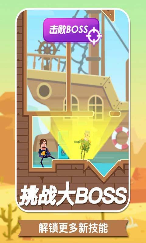 1、创新的采用了物理原理,玩家利用一颗子弹完成击杀任务,注意子弹射击到墙上会发生反弹。