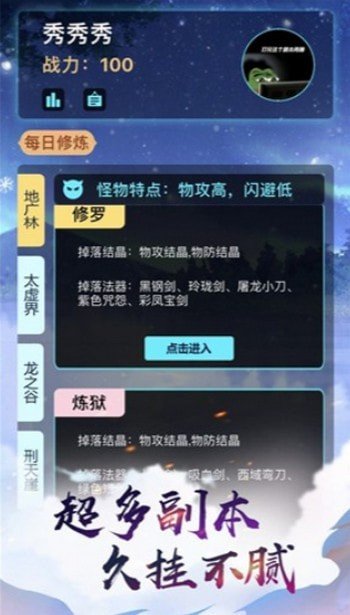 熬夜修仙红包版,超多的副本等着你前来挑战!海量的装备给予你带来超强的战斗力,升级属性为你展开超神成仙的激情,即使离线也能领取收益,红包等着你来拿!修仙的乐趣所在这里都有哦,千万不要错过!熬夜修仙红包版是一款仙侠冒险战斗类角色扮演动作手游,在这里你可以用更多趣味的方式让你更好的进行修仙,同时还可以和其他的仙友们互相进行激励,快来与自己的小伙伴一起进行冒险对战。