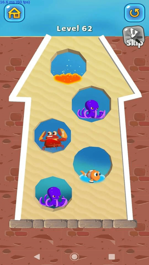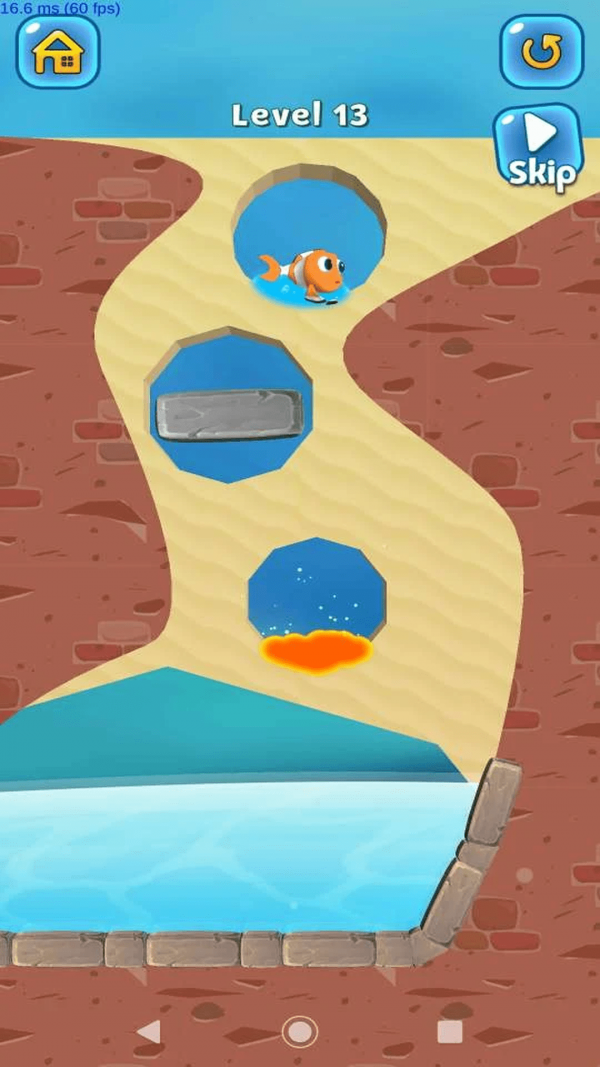 游戏过程中你只需要简单的操控屏幕就可以了,每个关卡都是精心设计过的,因此你的体验感会非常的强烈,而且只有掌握更多的技巧,才能够让鱼儿轻松地回到水中,结构组成不复杂,一目了然,结合欢快的背景音效,能够给人一种很轻松的感觉,不会带来太紧张的压迫感,适合日常压力大的时候,玩一玩放松一下!