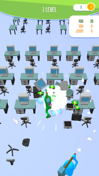 打工人起义游戏是一款拥有丰富的游戏剧情的模拟类游戏,游戏设置了精美的关卡内容,高度自由的游戏模式,玩家可以控制橡皮人在游戏中肆意妄为,用锤子疯狂的破坏所有物品,操作非常的简单,方向键位控制你的走向,拾取键位兼任了拾取和攻击的能力。无论是赤手空拳砸电脑,还是拿起家伙拆大梁,总之你都能够收获极大的解压感。游戏的结束的时候会对你的操作进行评分,在你会获得一定的金币奖励。在这里尽情的解锁更多的道具,在办公室中自由的破坏,将所有的物品全部击碎。尽情的在你的办公室中大闹一场来宣泄你对于日常生活之中的那些不满吧。