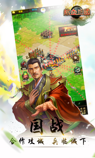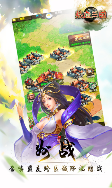 热血三国正版还原热血三国玩法剧情,游戏场景真实复古,捉将攻城点燃你的激情,让你见识最真实、最逼真的计谋策略,胜负不再只看战力;万人激情在线,一个人的力量终究有限,团结在一起,什么都不怕。结成狼群,侵占敌国;或者抱团取暖,守望相助。除了游戏,你将收获充实的生活和友情。游戏内有大量PVE玩法,指挥军团平定乡野的土匪贼寇,或驱逐盘踞具有丰富矿藏的山贼豪强等等。游戏中玩家可以任意选择自己喜欢的国家。然后通过征战四方来提升自己的战斗力。玩家还可以招募强大的三国武将,招兵买马养精蓄锐蓄势待发,快叫上你的小伙伴一起驰骋战场吧!