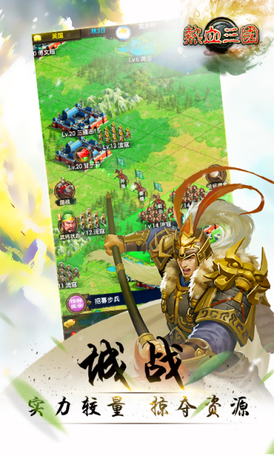 金戈铁马,乱世称雄;狼烟再起,谁与争锋!攻城掠地、征战天下是每个热血君主的追求。手游热血三国特色PVP系统——攻城略地带你征战沙场,笑傲三国!玩家通过攻城掠地占领城池、寻访名将,获取大量黄金、将领卡牌碎片、神兵碎片,快速提升战力,走上人生巅峰!玩家以自己的主城为据点,积累资源,发展经济,强化军事力量,最终在游戏中称王称霸。当然游戏中有许多功能,玩家需要自己计划安排,利用这些有趣而实用的功能来使自己变得强大。玩家可以再地图上攻打流寇来获取资源和额外道具,或者攻打其他玩家主城来掠夺资源。