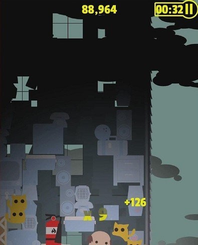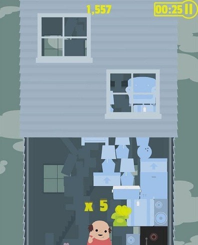 1.对不断从楼上往下掉的家具道具。你要做的是将它粉碎并尽可能的让自己跳上家具往上走!