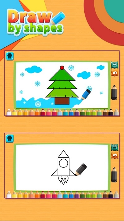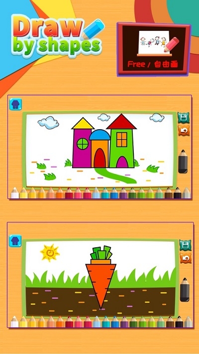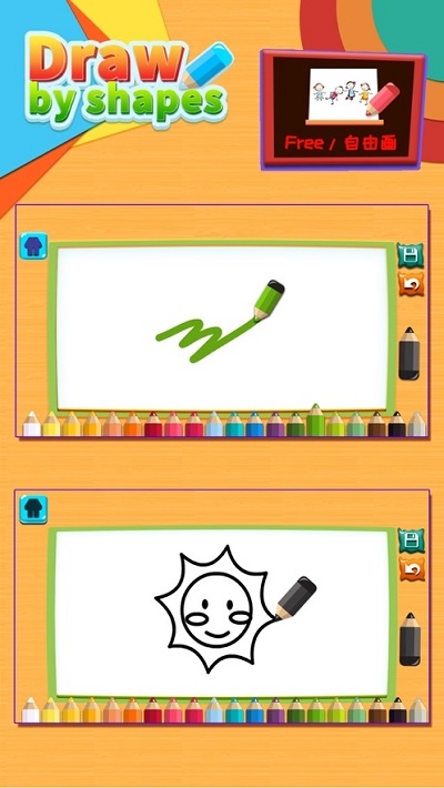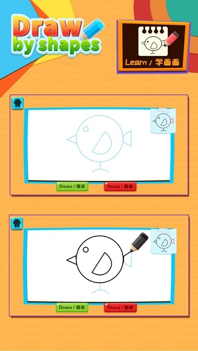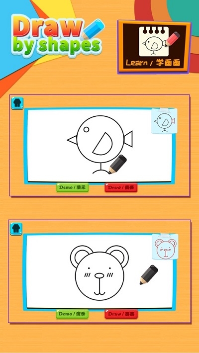 本游戏是不可多得的幼儿游戏。他尊重儿童的天性,把学习画画变成有趣的游戏,从孩子的兴趣出发,简单的形状拼合成有趣的画。让绘画变的简单有趣。 选取简单的几何形状转化成生动活泼的画面。每个绘画步骤重点线条采用不同的颜色提示,让用户快速的养成一个属于她自己的早教艺术习惯,是非常不错的手机早教平台,还能提高自己孩子的素质,是非常不错的手机软件,喜欢就来下载吧!