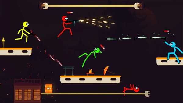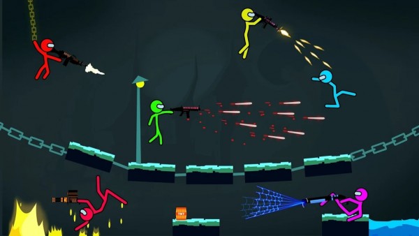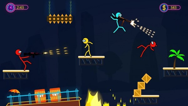 1、有2到4名本地或在线多人的游戏玩家,4名火柴人同时战斗,相互射击,武器会随掉落,包含了狙击枪、喷火器、冲锋枪等多种武器。