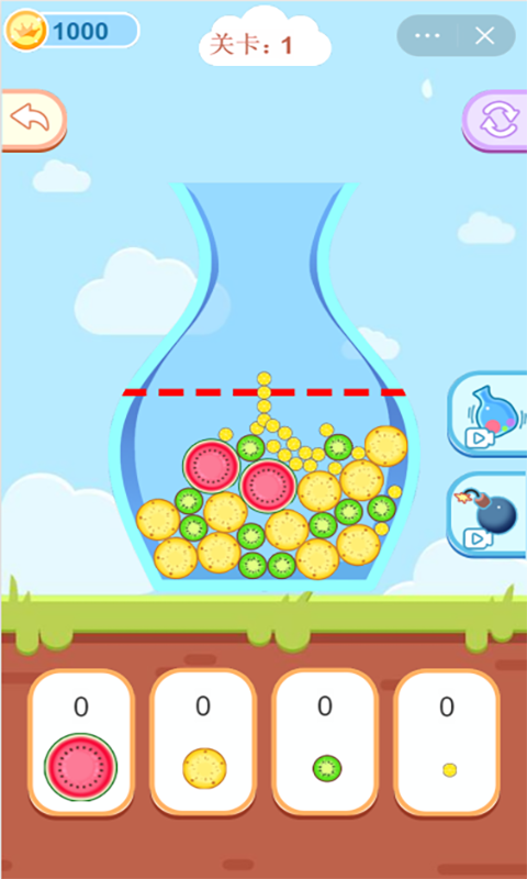 3、西瓜不能整合。当装满水果的屏幕高度到达零点时,挑战就结束了。