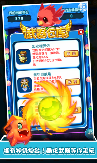 游戏中的道具有三种:瞄准、炸弹和盾牌。道具会在玩家消掉含有道具的泡泡时即时生效,道具的功能及乐趣我们在此卖个关子,有待作为玩家的您慢慢去体会。