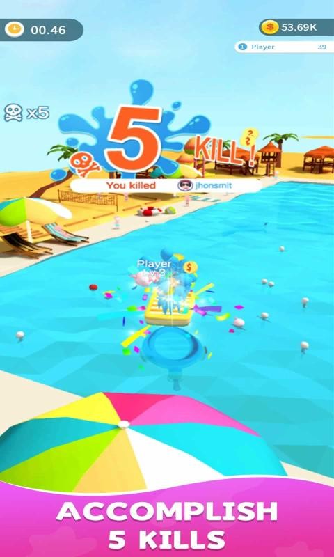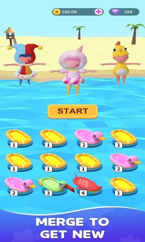 玩家利用金币购买低等级的皮划艇,利用两个相同等级的皮划艇合成为高等级的皮划艇,利用它在泳池中拯救溺水的人,拯救的越多,排名越高,越容易获得冠军!皮划艇等级最高位为30,等级越高的皮划艇越坚固,游戏中有10个角色,8张地图,各种任务和成就等待你的体验!