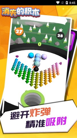 消失的积木是一款休闲积木小游戏画面非常精致流畅,是一款非常有意思的闯关休闲游戏,游戏画面简约清新,玩家控制自己的黑洞不断的吞噬积木来庞大自己的体积,每一关中都有不同的积木堆积在那里,而玩家要做的则是通过移动黑洞将积木精准吸附进去。小心躲避积木周围的炸弹,顺利完成挑战之后即可获得丰厚的奖励,解锁更多有趣的关卡。快来尝试一下吧!
