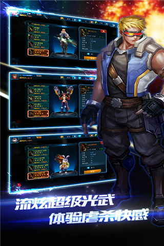 玩家除主角升级外,还有一个女性角色和卡通角色,三种角色多种体验。游戏有15个章节,每个章节拥有8个关卡,120个战斗场景永不重叠,新鲜感永不停歇。