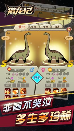猎龙记是一款可以捕猎各种恐龙来作为宠物进行战斗的放置战斗冒险游戏,一般挂机和卡牌游戏都有着同一个世界,同一个核心系统——抽卡,然而抽卡这个东西,关乎气运和玄学,一旦走黑,极度影响游戏体验和游戏心情。为了保护大家的小心肝,我们着重开发出繁衍系统,在繁衍系统下,即使不抽卡,也能通过繁衍后代龙,一步一步提升,提高宠物品质,获得最强的恐龙,收集各种不同的套装,点亮所有的天赋系统来增强你的战力,简单趣味的游戏玩法让你爱不释手,快来下载吧!