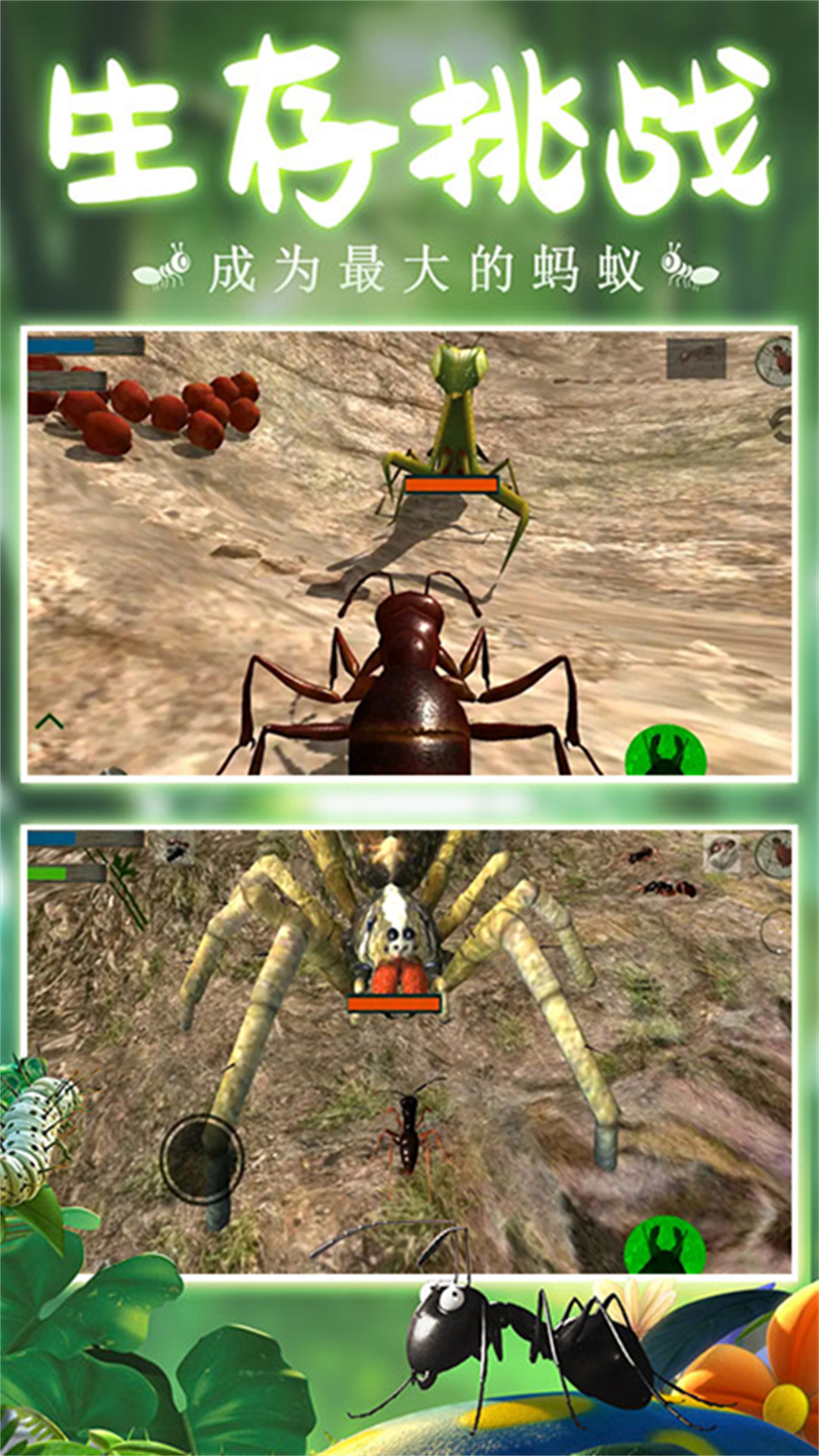《模拟蚂蚁大作战》是一款模拟经营类游戏,玩家将扮演蚂蚁巢穴的领导者,指挥你的蚂蚁大军进行各种生存挑战和战斗。在这个充满挑战和未知的世界里,你需要合理规划资源,发展你的蚂蚁帝国,并与其他生物争夺生存空间。