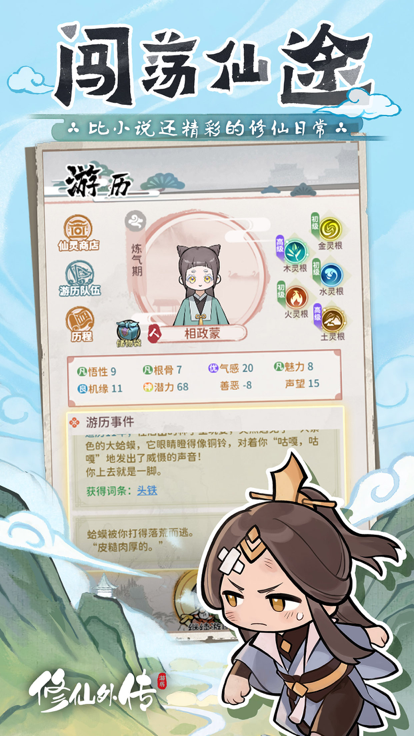 1. 在修仙外传正版中,玩家可以通过天降仙灵的方式,随机诞生超可爱的角色,并通过消耗道具选择天赋和自由加点来决定初始仙灵的属性。