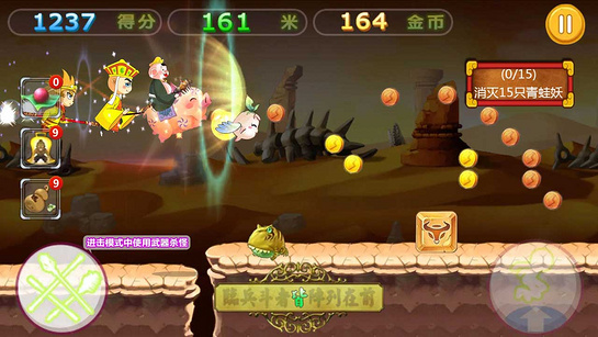 1. 玩家需要带领降魔队伍一路奔跑,消灭途中的妖怪,收集金币和道具。