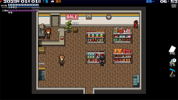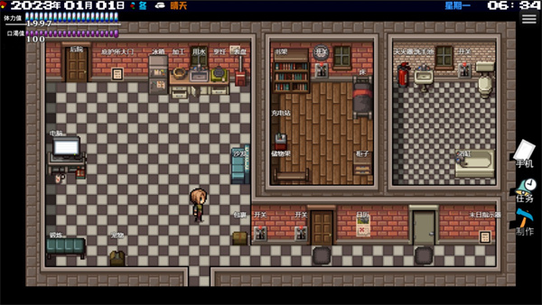 2. **注意健康与安全**:锻炼可以提高健康值,小诊所可以提供抗生素和治疗服务。同时,要注意疲劳值,及时回家睡觉或使用睡袋恢复体力。