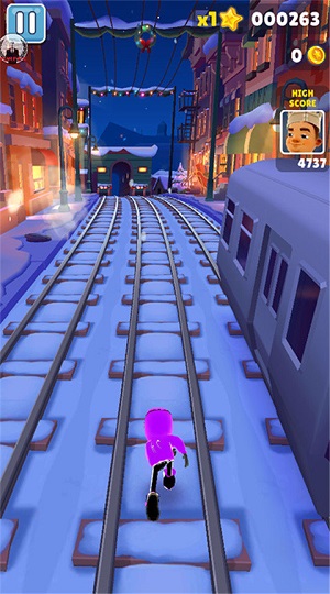 1. 场景:游戏场景为雪地,玩家需要在冰雪覆盖的地铁轨道上奔跑,躲避各种障碍物,如列车、路障等。