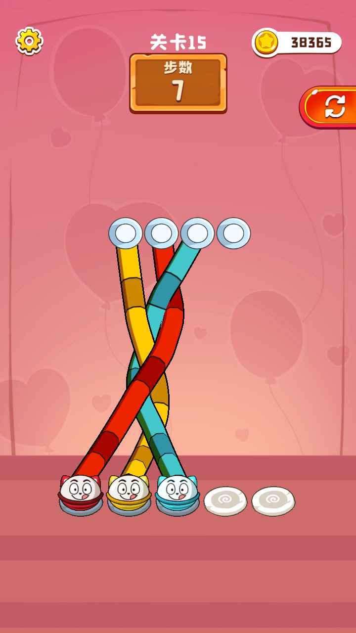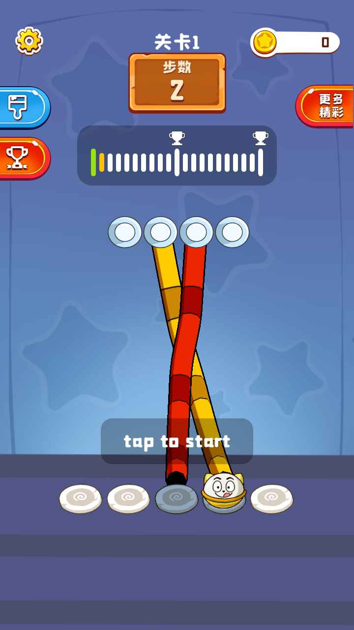 3. 达成目标:按照颜色或特定规则将彩绳排列整齐,完成关卡目标。