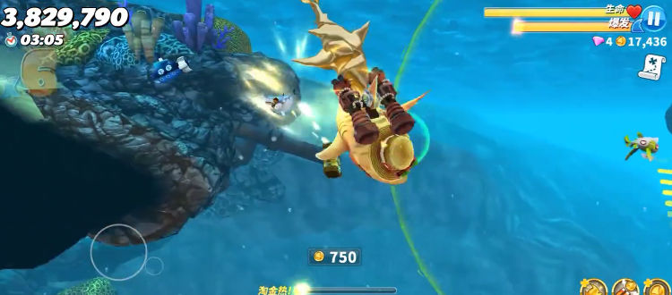 5. 直观的操作方式:游戏采用虚拟摇杆的控制方式,手机可以横置,一侧屏幕用于控制方向,另一侧控制鲨鱼进攻冲刺,操作简便且易上手。