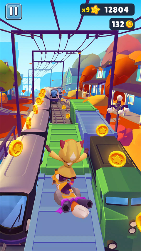 3. 跑酷挑战:控制角色在地铁轨道上奔跑,躲避列车、障碍等,同时收集金币和道具。