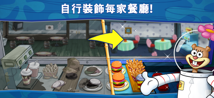 5. 装饰与升级:通过赚取的金币,玩家可以自由装饰和升级餐厅,打造独一无二的蟹堡王,吸引更多顾客光临。