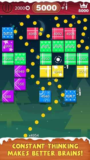 2. 玩家发射雪球,击中并摧毁砖块,同时收集掉落的礼物和奖励。