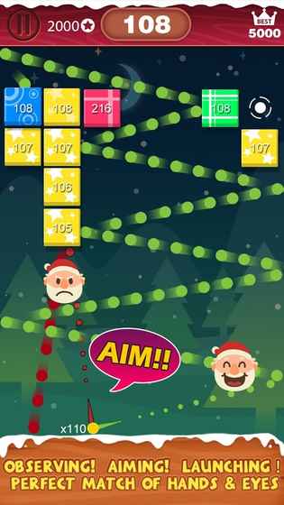 1. 游戏开始时,圣诞老人站在底部中央,屏幕上方出现一排砖块。