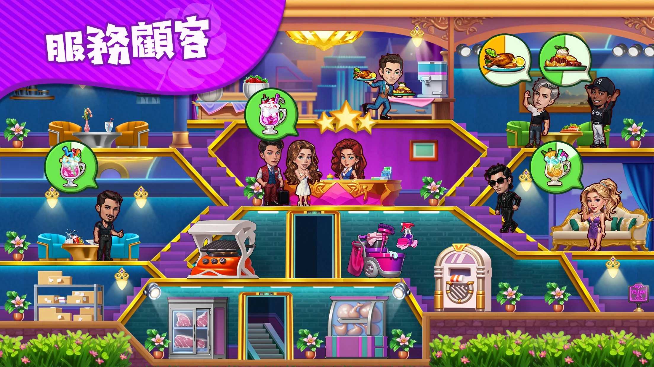 2. 运营发展:通过完成任务、挑战获得奖励,解锁更多设施和服务,逐步扩大酒店规模。