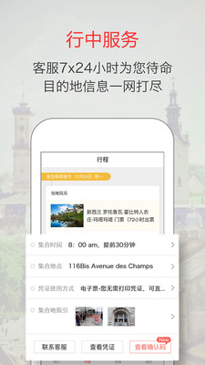 3. 行程:专业旅行专家免费订制,私人专属行程;APP行中服务,提供出行相关信息,全程交通导航。