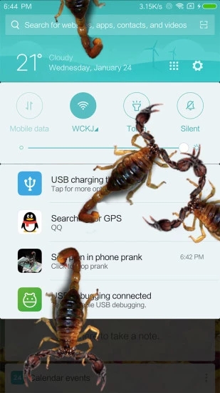 比如假借用好友的手机打电话,悄悄安装启动本应用,设置延时10秒显示蝎子,然后将手机还回给好友,好友拿到手机后,不久就会出现蝎子在手机上爬行,好友会被吓到的,达到恶作剧的效果。