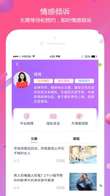 花田情感,是非常不错的掌上女性情感咨询的app,在这里有着超多的干货等你来学习,让你轻松懂得作为一个女性怎么相处各种关系,抒发自己内心的情感,提升自己的个人魅力,花田情感是一款专注女性情感咨询平台,包括恋爱、婚恋、情感挽回等心理咨询,还有高质量情感资源,实现女性终生自我提升,在线提供丰富专业的情感课程,为你指点迷津。