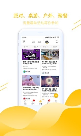 2. 邀约 - 各种轰趴派对、桌游聚会、观影聚餐、读书沙龙、创业交流、融资路演、公益志愿者、户外旅游等等活动等你参与