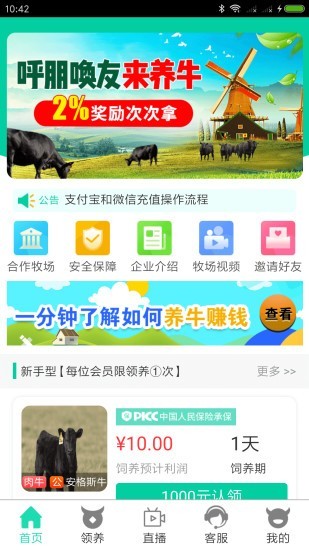 1、振通富农实时为用户认领一只小羊和小牛进行养殖,牧场主每天获得收益;