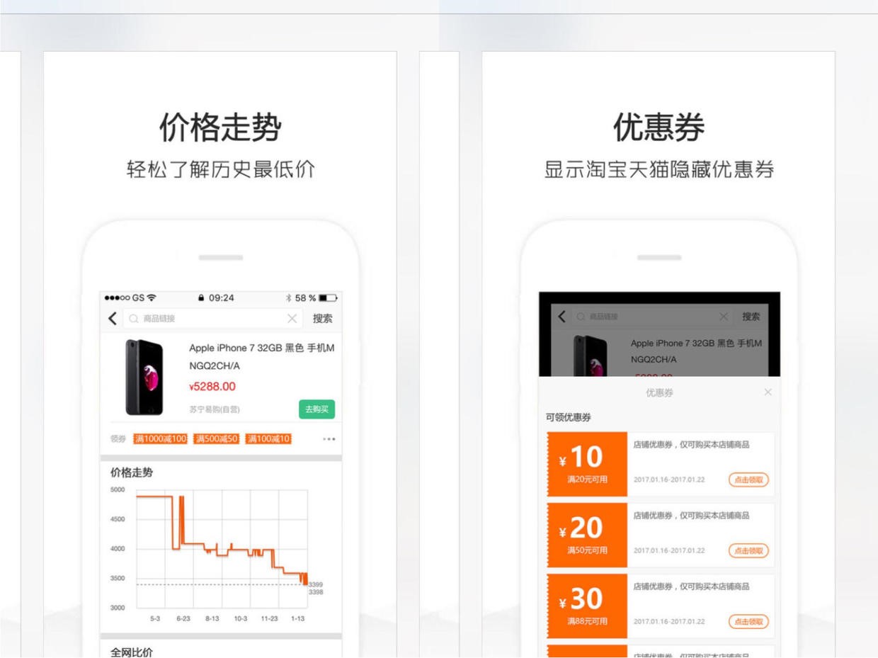 3.复制商品链接,查一查该商品两年内的历史价格走势,领取店铺内部优惠券,识破商家虚假促销,实时掌控历史低价。设置降价提醒,让你第一时间买到最实惠的商品。