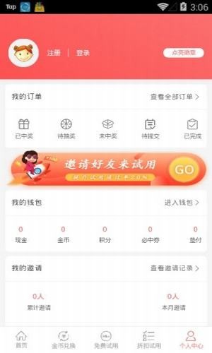 免费试用、一折兑换、中奖订单管理、再次参与、试用进展、帮助中心、个人中心等