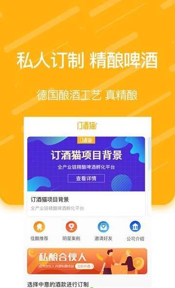订酒猫app为需要大量订酒的用户提供一个拥有海量啤酒种类的的使用渠道,有了订酒猫这款软件,无论是公司还是宴席,用户都可以一键快速完成大量订酒的任务,对于大单团购,都是成本价购买,在订酒猫平台这里,用户不仅可以大量订酒,还可以定制个性化精酿啤酒。
