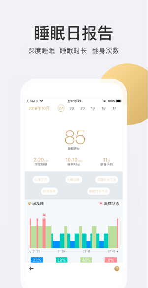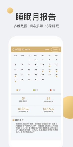 3、能够实时监测用户的睡眠数据,生成睡眠月报告,还会根据个人的睡眠数据提供睡眠建议。