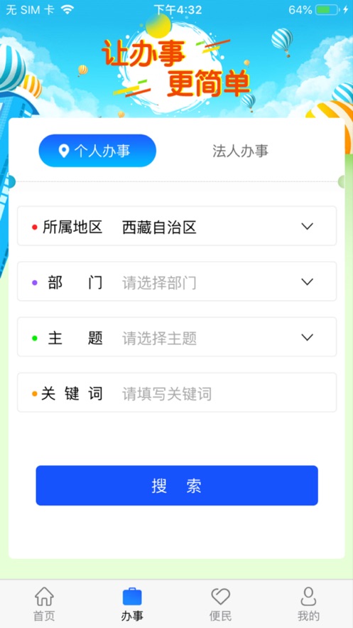 【支持全文检索】西藏政务服务平台登录APP集成全文检索引擎,对聚合的全部资源进行全文检索,快速定位所需的服务信息。