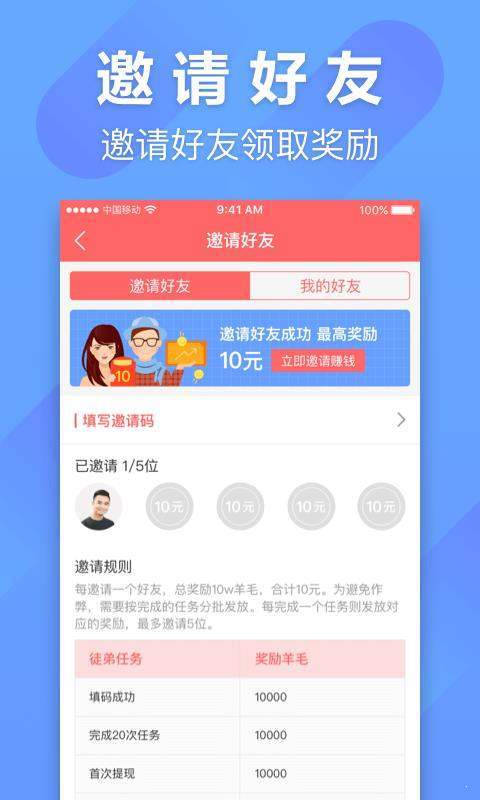 2、简单几步邀请好友,一起使用“羊毛赚服务”成为自己的徒弟,我们就能赚佣金奖励。