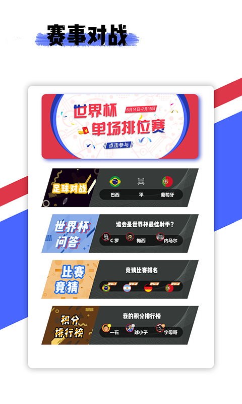 与各路球迷互动对战,预测赛事,看看谁才是足球神算子。