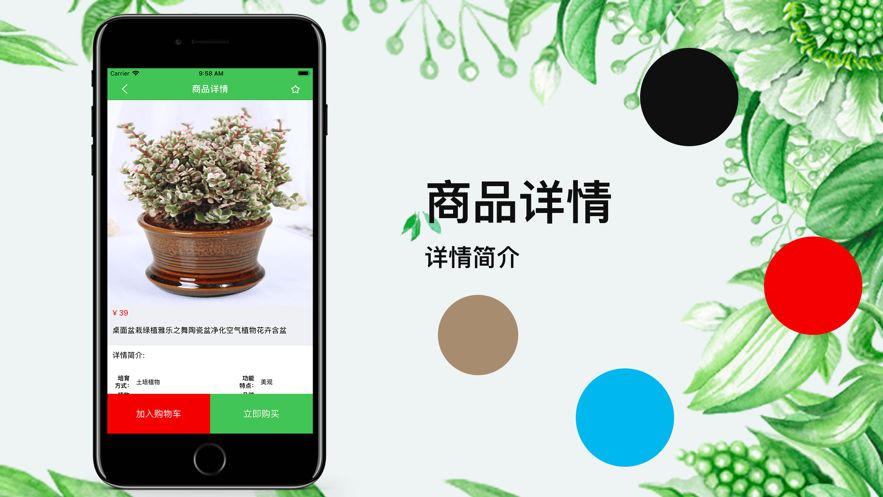 2.用户选择商品详情可查看植物的详细信息,可加入购物车或者立即购买。