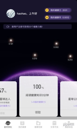 【健康币】健康币是基于个人在星球活动产生的奖励,可以用于星球的特权消耗与兑换等。