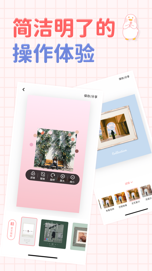 拼图鸭app是一款深受萌妹子喜欢的拼图滤镜应用,软件精选了50多种不同风格的滤镜,支持多种拼接尺寸,同时还可以快速的更换背景主题,让你的照片看起来更加的靓丽,一秒化身百变美少女,拼图鸭app进行使用是一款非常可爱的拼图滤镜软件,拼图鸭app拥有超多萌系滤镜,精选多种不同风格的滤镜,还可以自由拼接,萌系妹子的最爱,轻松打造可爱照片,欢迎广大朋友下载体验。