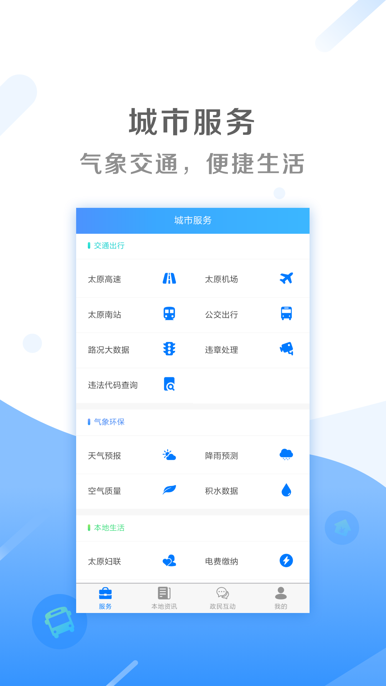 “我的太原”APP是太原市政府整合全市医疗、交通、旅游、便民、政务等各类应用,统一向企业和群众提供方便快捷的行政审批、公共服务等政务服务,实现全市政务服务事项“掌上办”、“指尖办”,提升群众获得感。让太原人民能够以更加方便的方式在上面除了生活当中的内容,不管是罚款缴费还是医院挂号你都能够在上面找到相对应的区域,保证你能够更加快速的处理以前的那些事情!