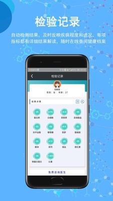 检测中心---随时使用智能手机扫描,进行尿液14项、阴道炎六联检、便潜血、小儿腹泻等项目检测,检验记录自动保存,并可进行趋势分析,随时监测健康状态。