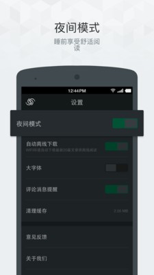 3、app支持离线下载模式,可以帮你将资讯缓存下来,没有网也能看,还可以切换夜间模式,让你的眼睛得到放松