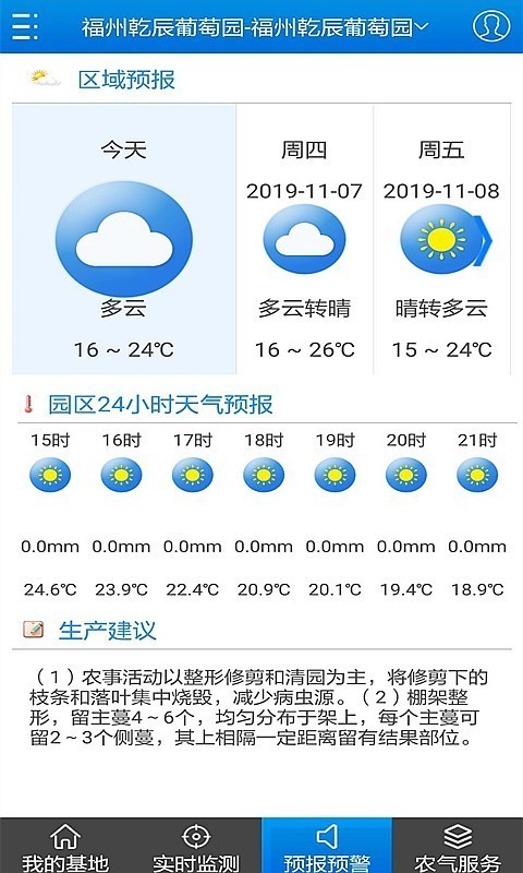 根据未来24小时的天气预报则,农气宝app可以推荐对应的农业生成建议。